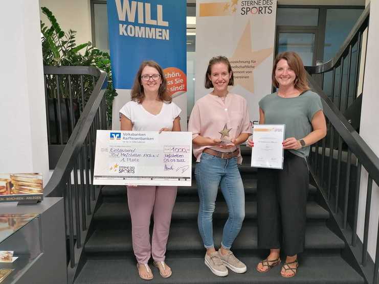 Großer Jubel beim TSV: Das Projekt “Kinder in Bewegung bringen - während und nach Corona” gewann auf regionaler Ebene beim Wettbewerb “Sterne des Sports”. Mit diesem Preis werden Vereine für ihr besonderes gesellschaftliches Engagement ausgezeichnet. Die Bewegungslandschaft, die der TSV mithilfe zahlreicher ehrenamtlicher Helfer während den Lockdowns angeboten hat, konnte die Jury überzeugen. Für den TSV war das Projekt ein voller Erfolg - auch nachdem der Sportbetrieb wieder aufgenommen wurde, verzeichnete der Verein einen hohen Mitgliederzuwachs. Sicherlich auch ein Verdienst des kostenlosen Bewegungsangebots während der Corona-Lockdowns. Der mit 1000 € prämierte Stern des Sports in Bronze wurde vom Vorsitzenden der Bezirksvereinigung der Volksbanken Raiffeisenbanken im Zollernalbkreis, Herr Ständer, an den TSV überreicht. Nun darf der TSV in der nächsten Runde auf Landesebene um die Sterne des Sports in Silber antreten.